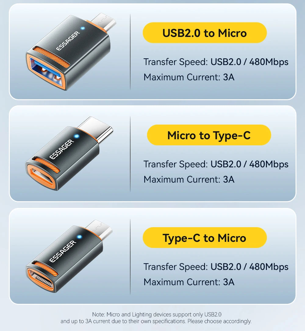 Micro female to Type-C male (transmission speed: USB 2.0; maximum current: 3A)
