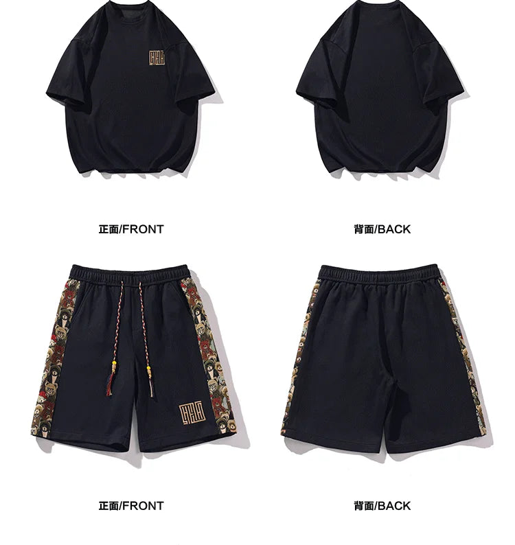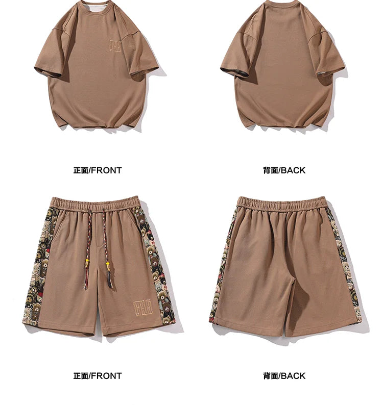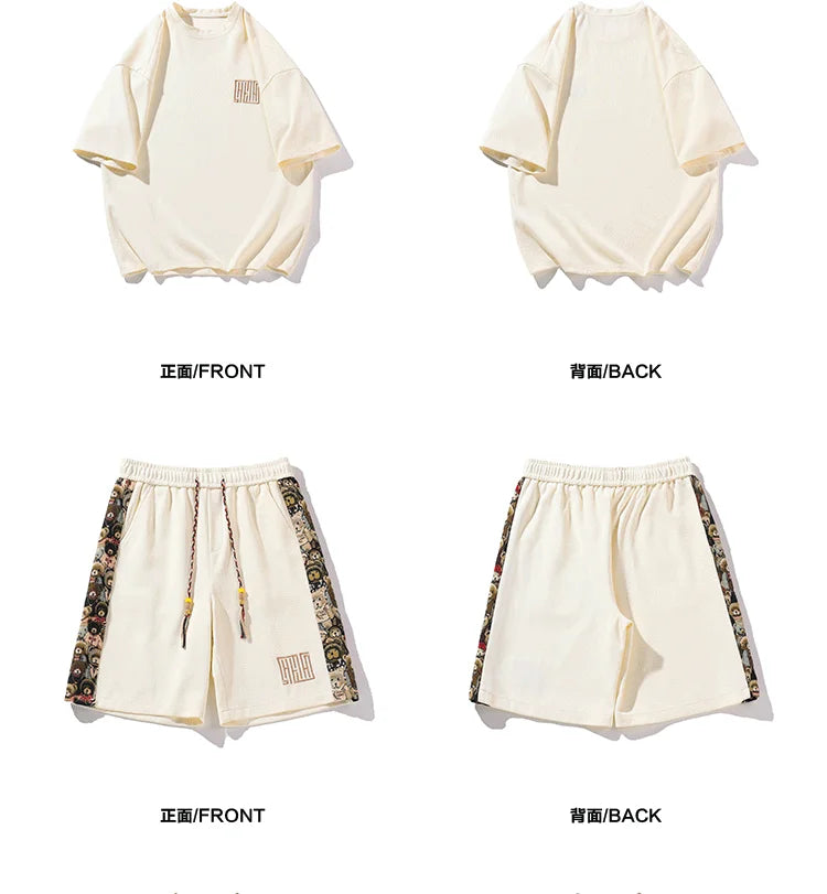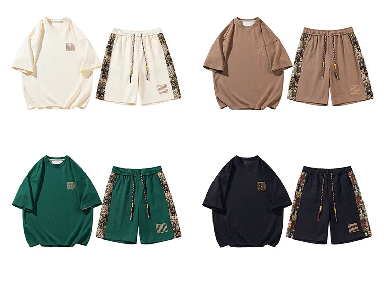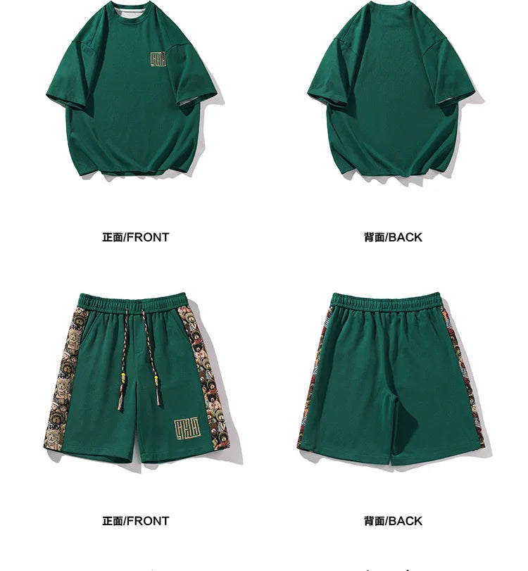 Summer New 4Colors Men Sets Casual Short-sleeved O-neck Tshirt Side Embroidery Knee-length Trousers Fashion Street Men Suits